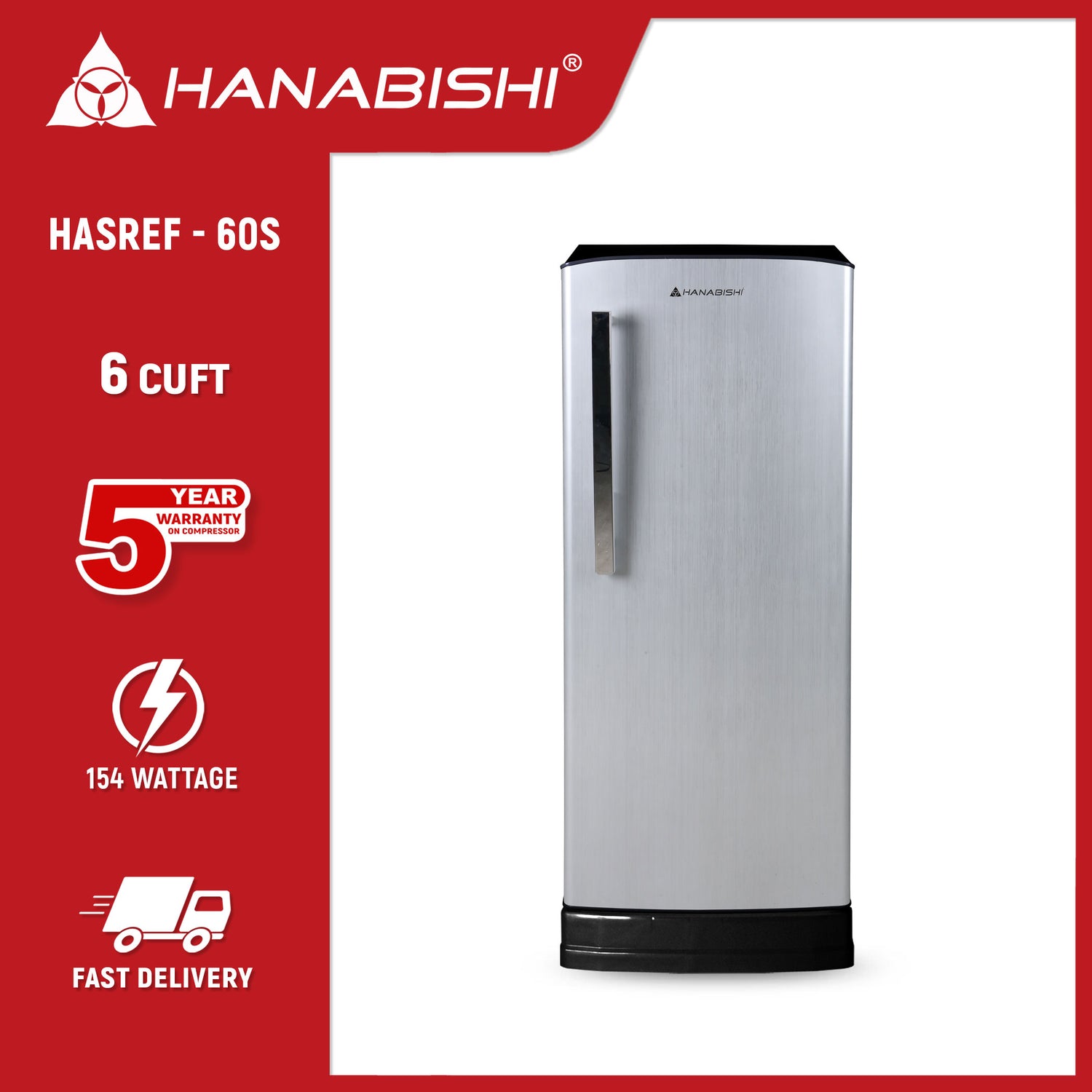 The HANABISHI HASREF-60S 6.0 cu.ft. Single Door Refrigerator offers a spacious and efficient cooling solution for your kitchen. With a sleek design and reliable performance, this refrigerator provides 6.0 cu.ft. of storage capacity for all your food and beverage needs. Keep your groceries fresh and organized with ease.