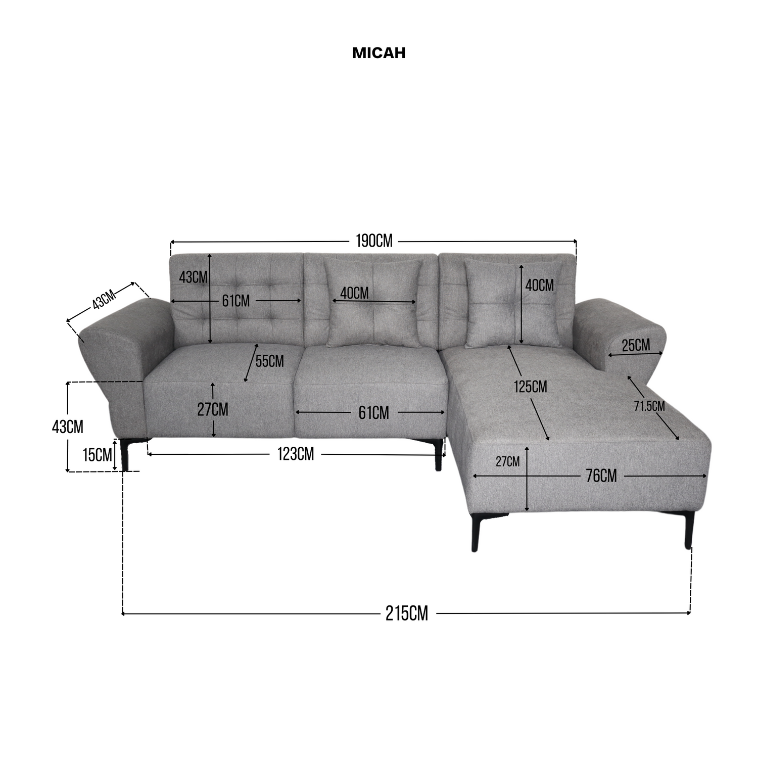 MICAH L-Shape Fabric Sofa is a comfortable and stylish living room piece that features a modern design and spacious seating. This sofa boasts a sleek and minimalist profile, with a solid wooden frame and plush cushioning, ensuring optimal comfort for you and your guests. Its L-shaped design provides ample seating space to accommodate multiple people, while its neutral color blends well with a variety of home décor styles. Whether you're watching your favorite shows or lounging with friends.
